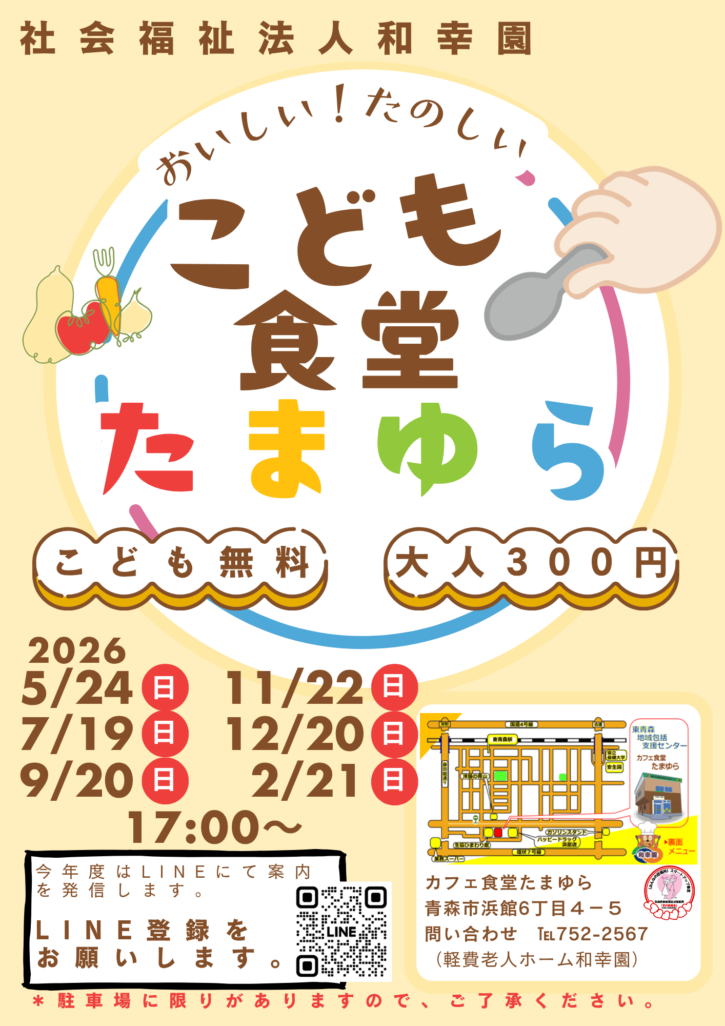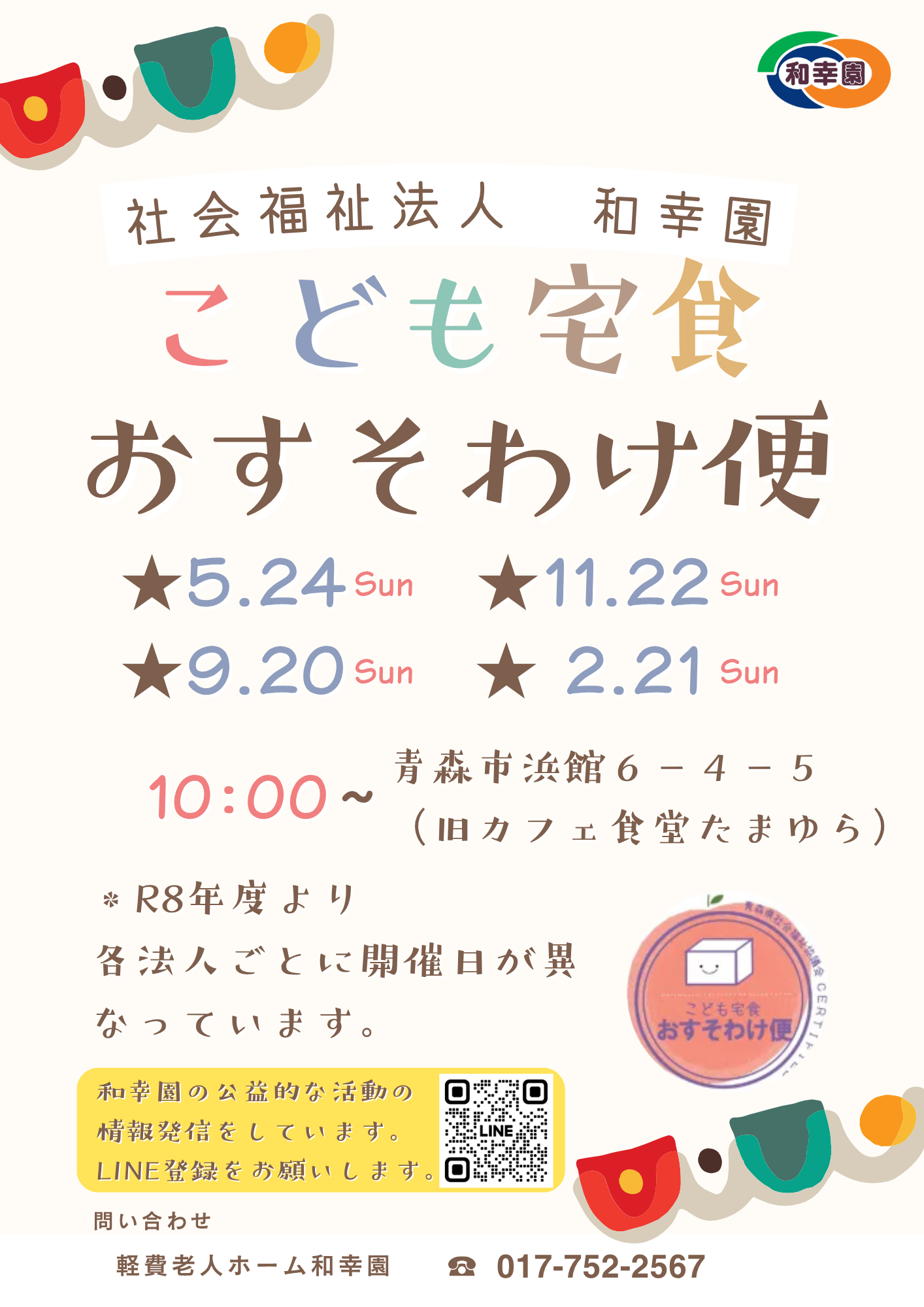 - 和幸園では、社会貢献活動の一環として青森県社会福祉協議会の活動に参画し、「こども食堂」を実施しています。 詳細は右記下記パンフレットをご参照ください。